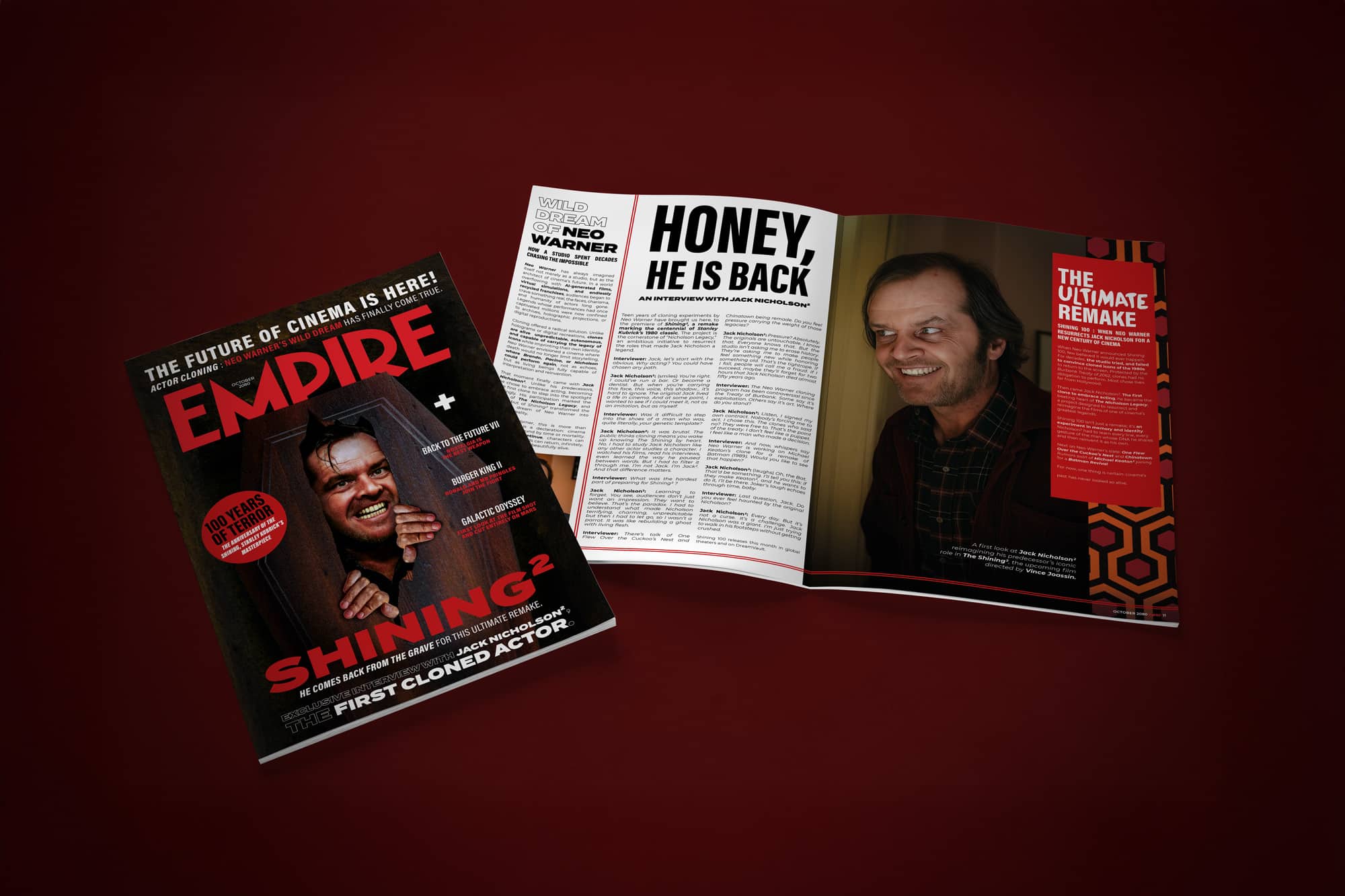 Création de la cover et d’une double page du magazine EMPIRE en 2080. Le magazine parle des actualités du cinéma et annonce l’arrivée du premier clone d’acteur prêt à jouer dans un remake d’un film connu des années 80 : Shining² .