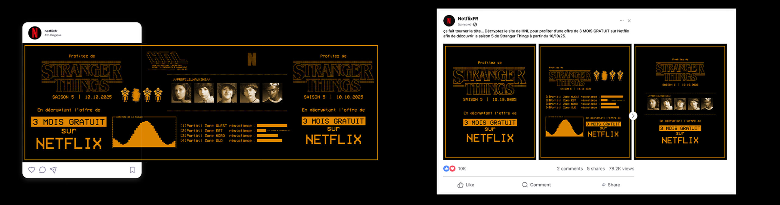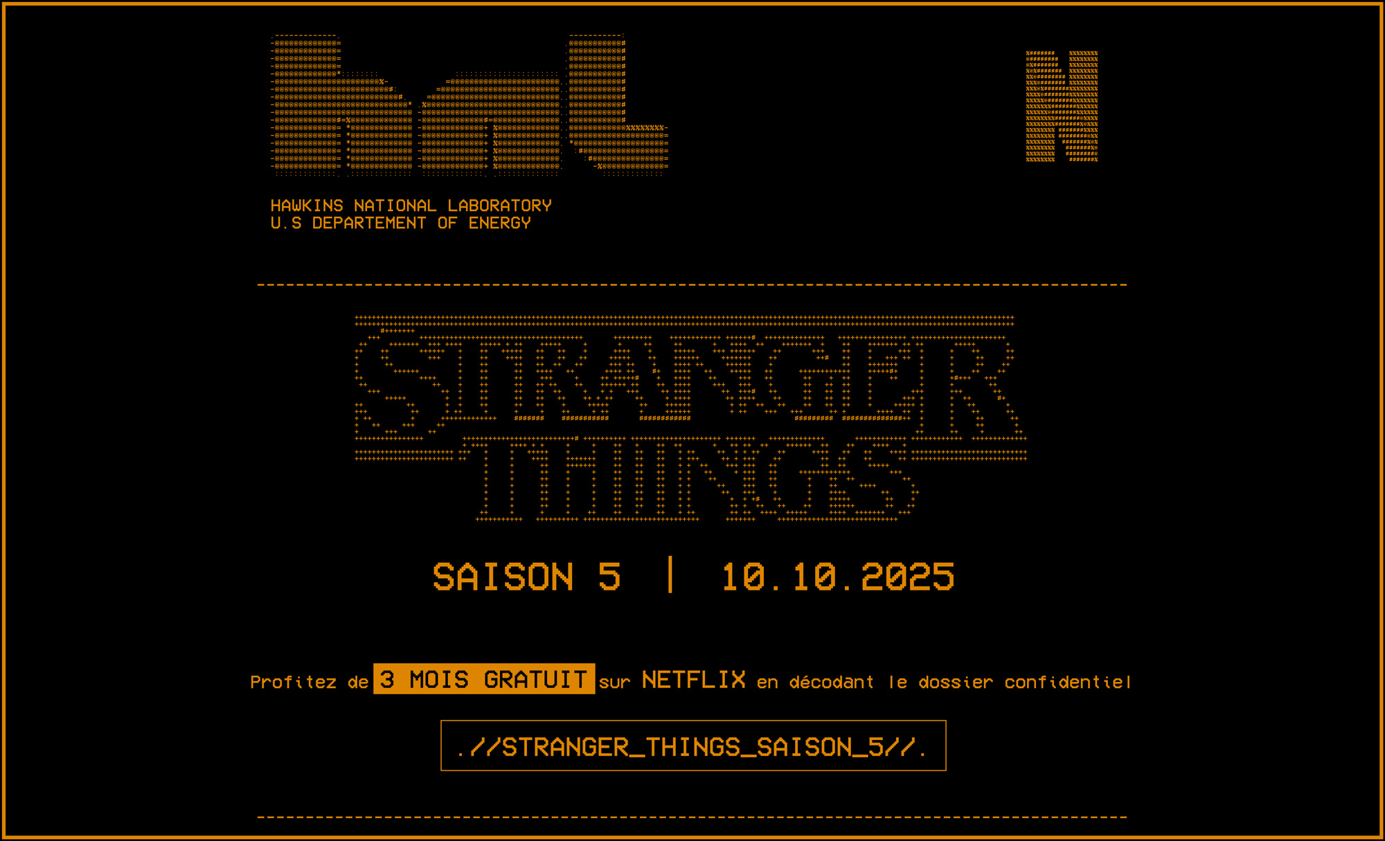 Création d’une Landing Page et d’une campagne digitale immersive pour promouvoir la Saison 5 de Stranger Things. Le concept s’inspire des interfaces Minitel des années 80, mêlant nostalgie tech et atmosphère de piratage clandestin.